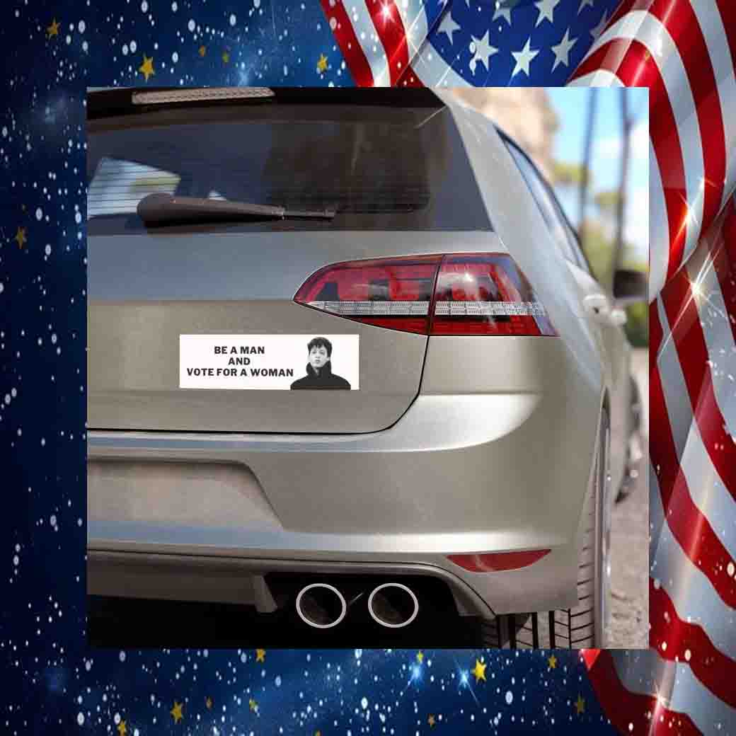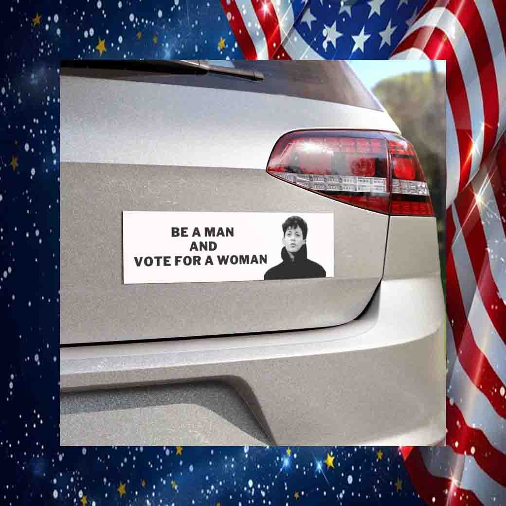 Show your support for gender equality and encourage others to do the same with our bold and impactful “Be A Man And Vote For A Woman” car magnet.