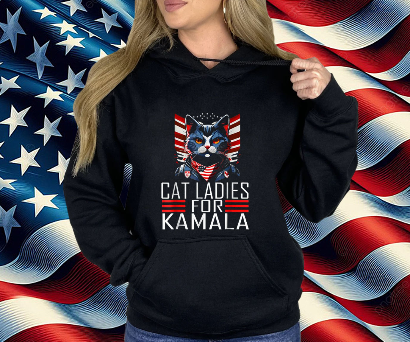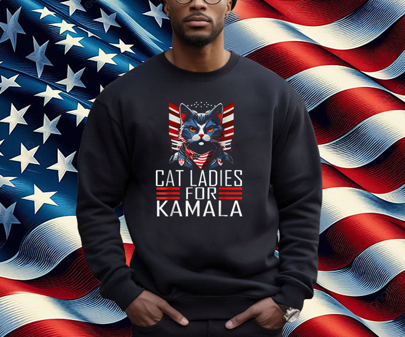 Eye-Catching Design: Features a playful graphic of a cat wearing a Kamala Harris headband, with the slogan “Cat Ladies for Kamala.”