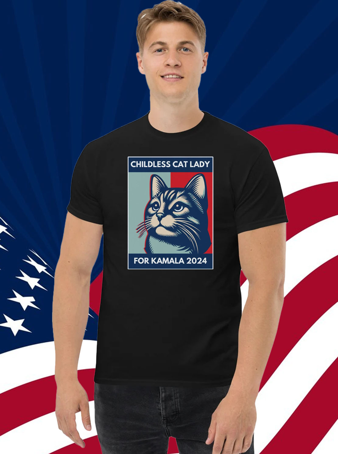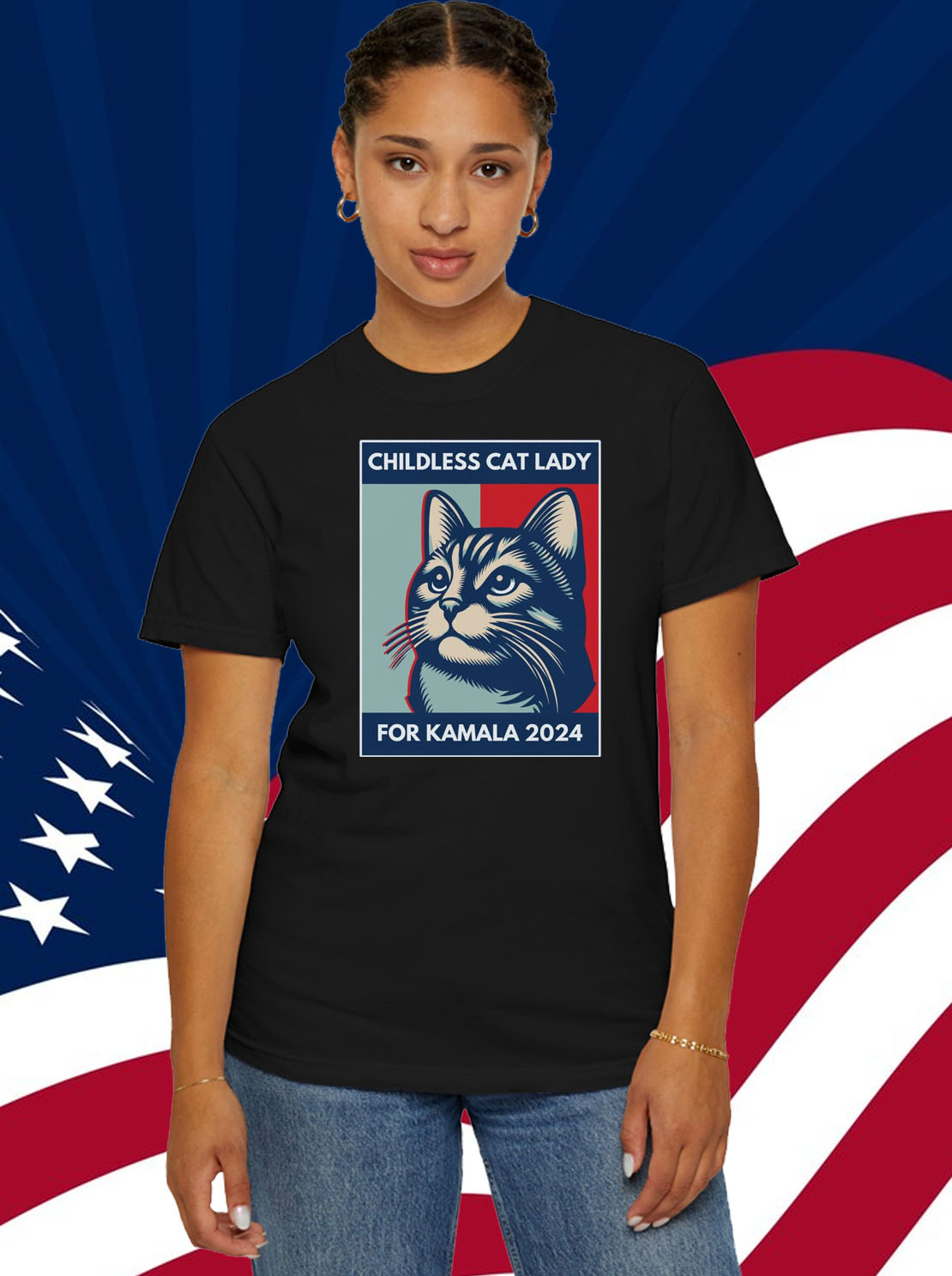 Vibrant, eye-catching design featuring a silhouette of Kamala Harris with the iconic “Childless Cat Lady” slogan