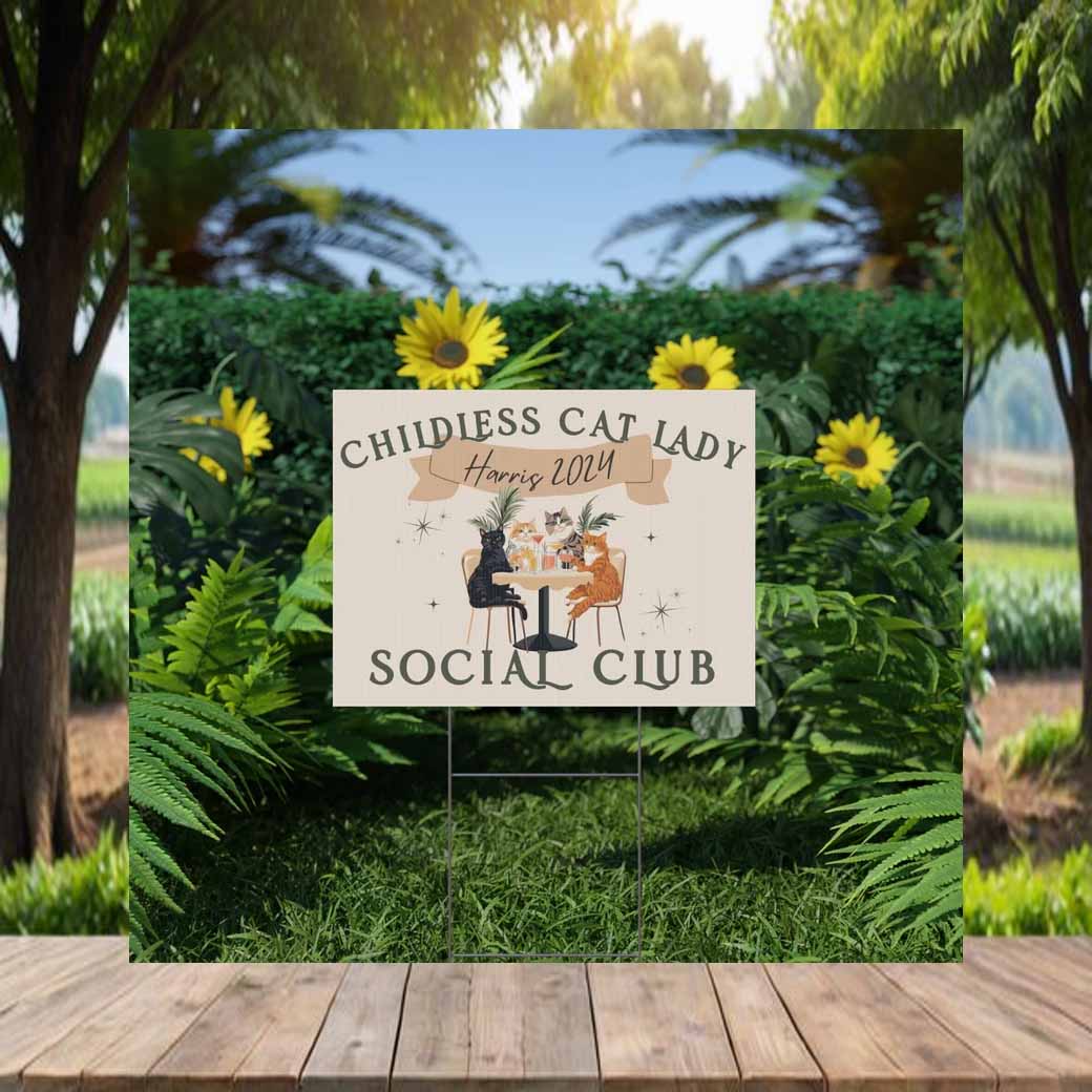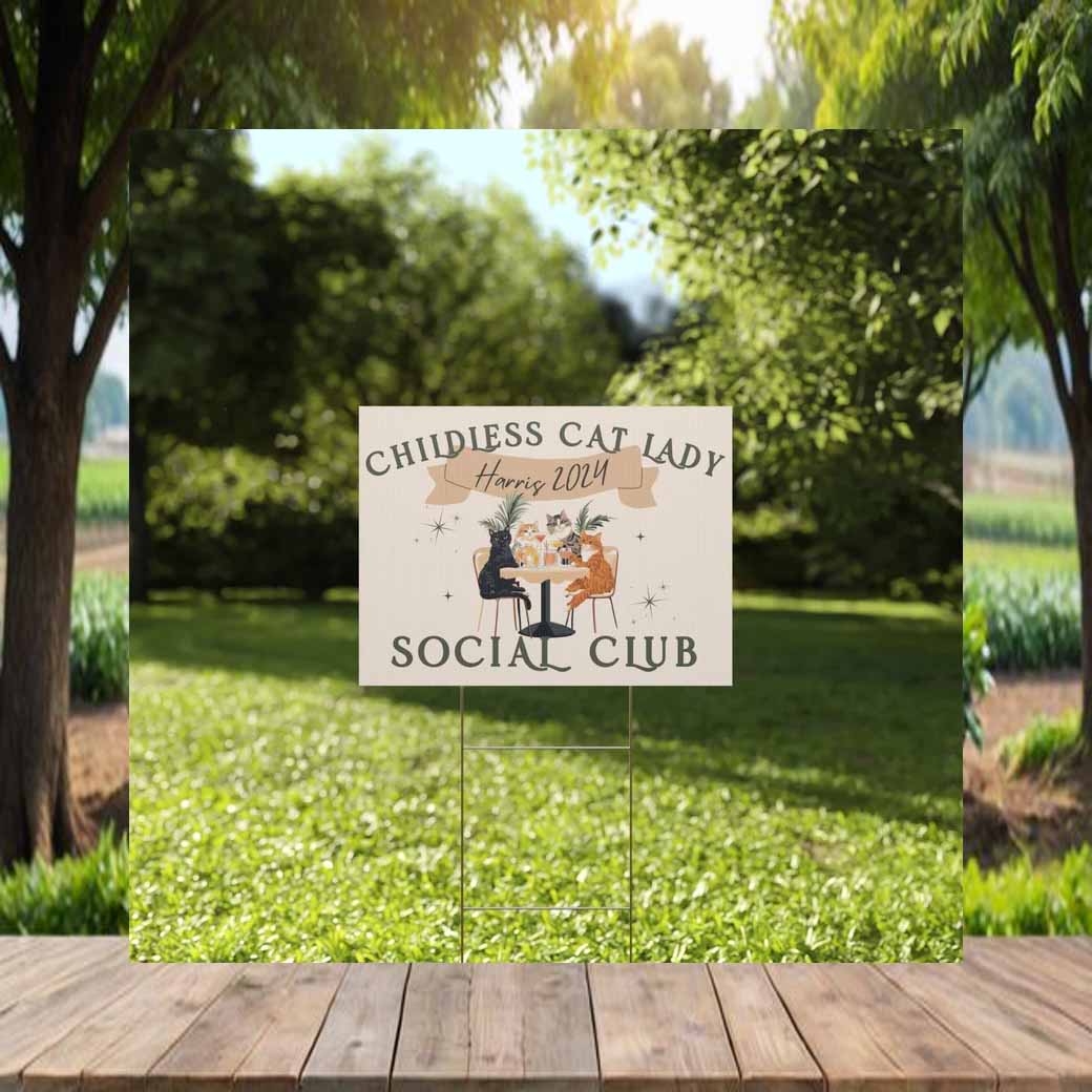 Show your support for the Childless Cat Lady Social Club and the Harris Walz campaign with this eye-catching yard sign!