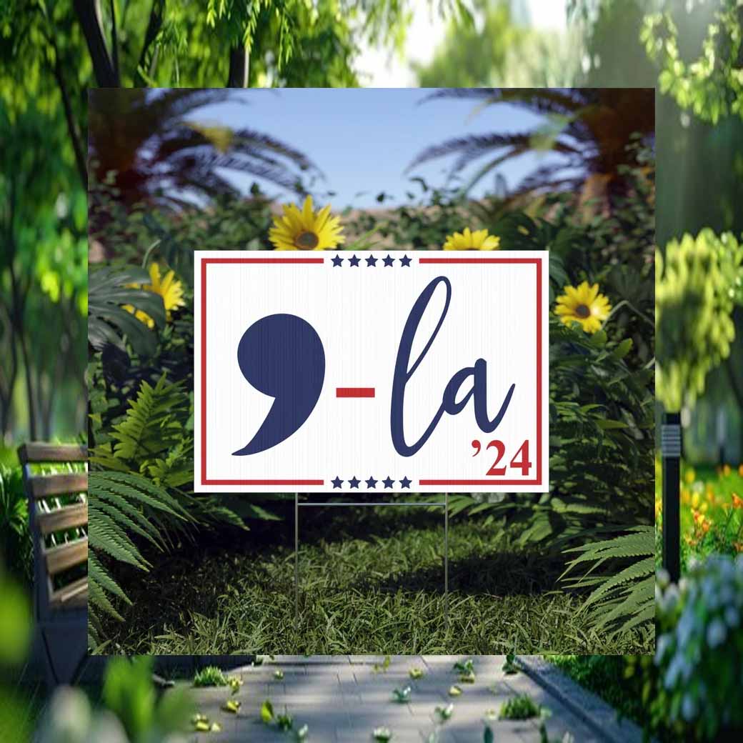 Bold and eye-catching design with “Comma La Kamala Harris ’24” prominently displayed