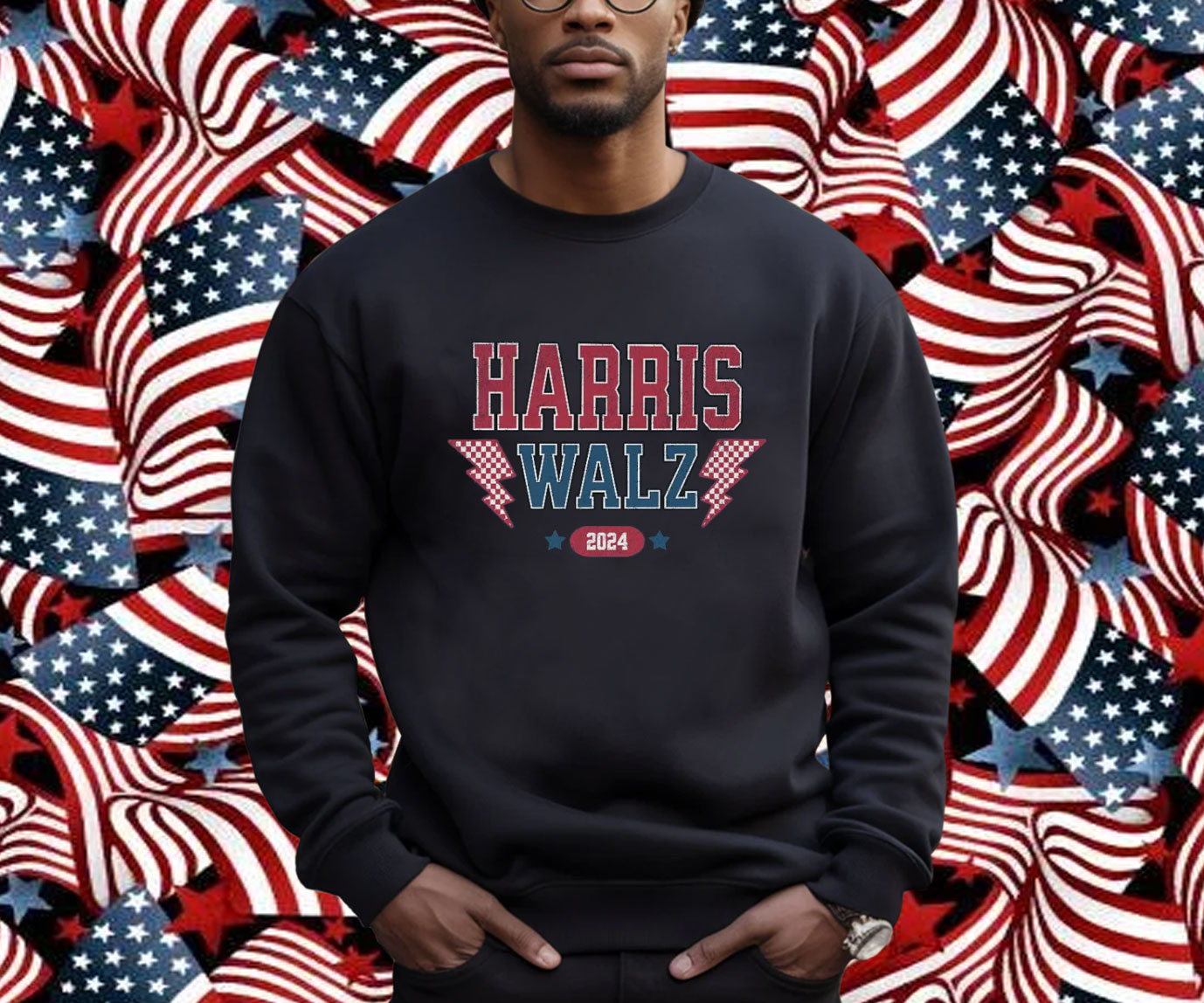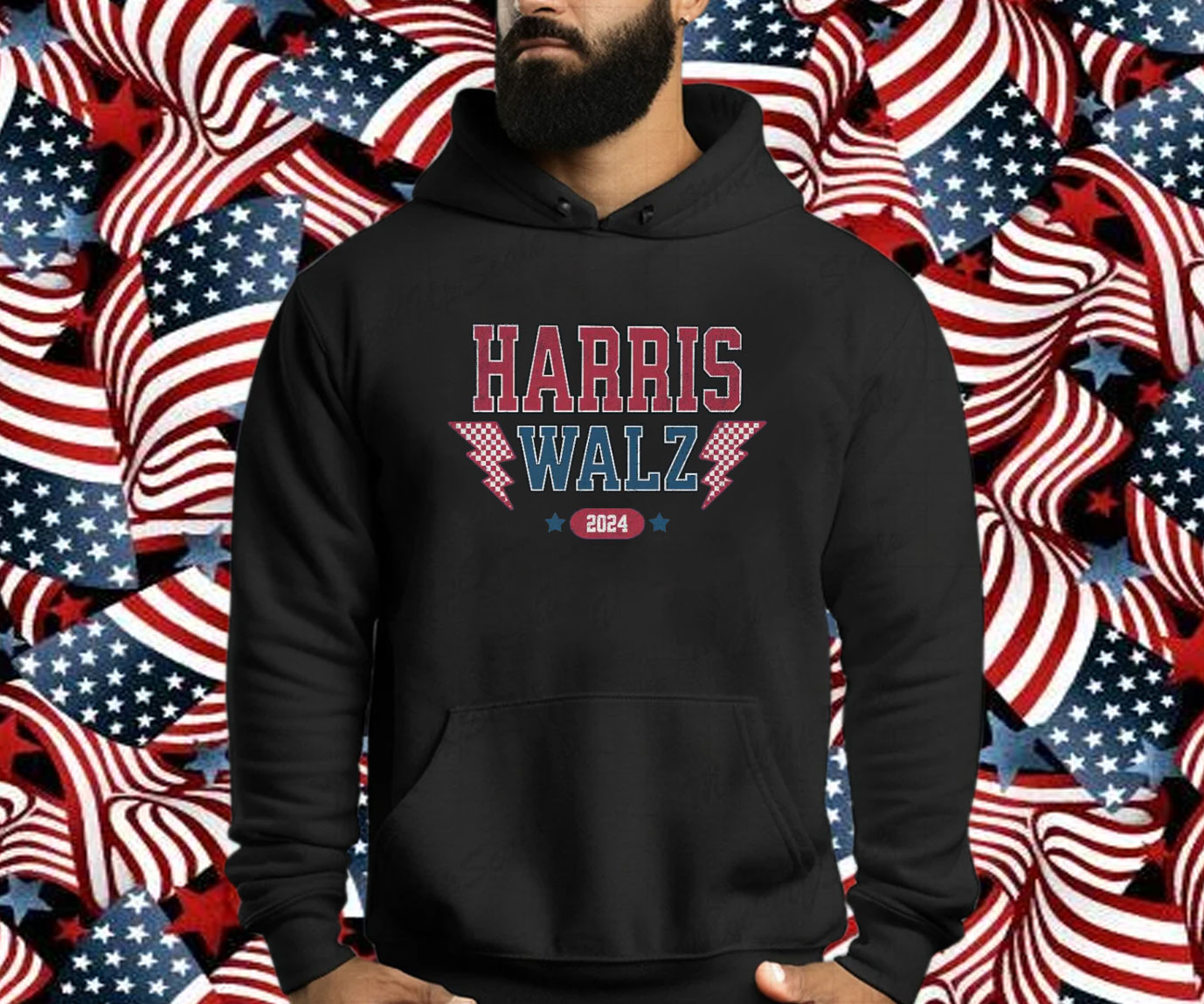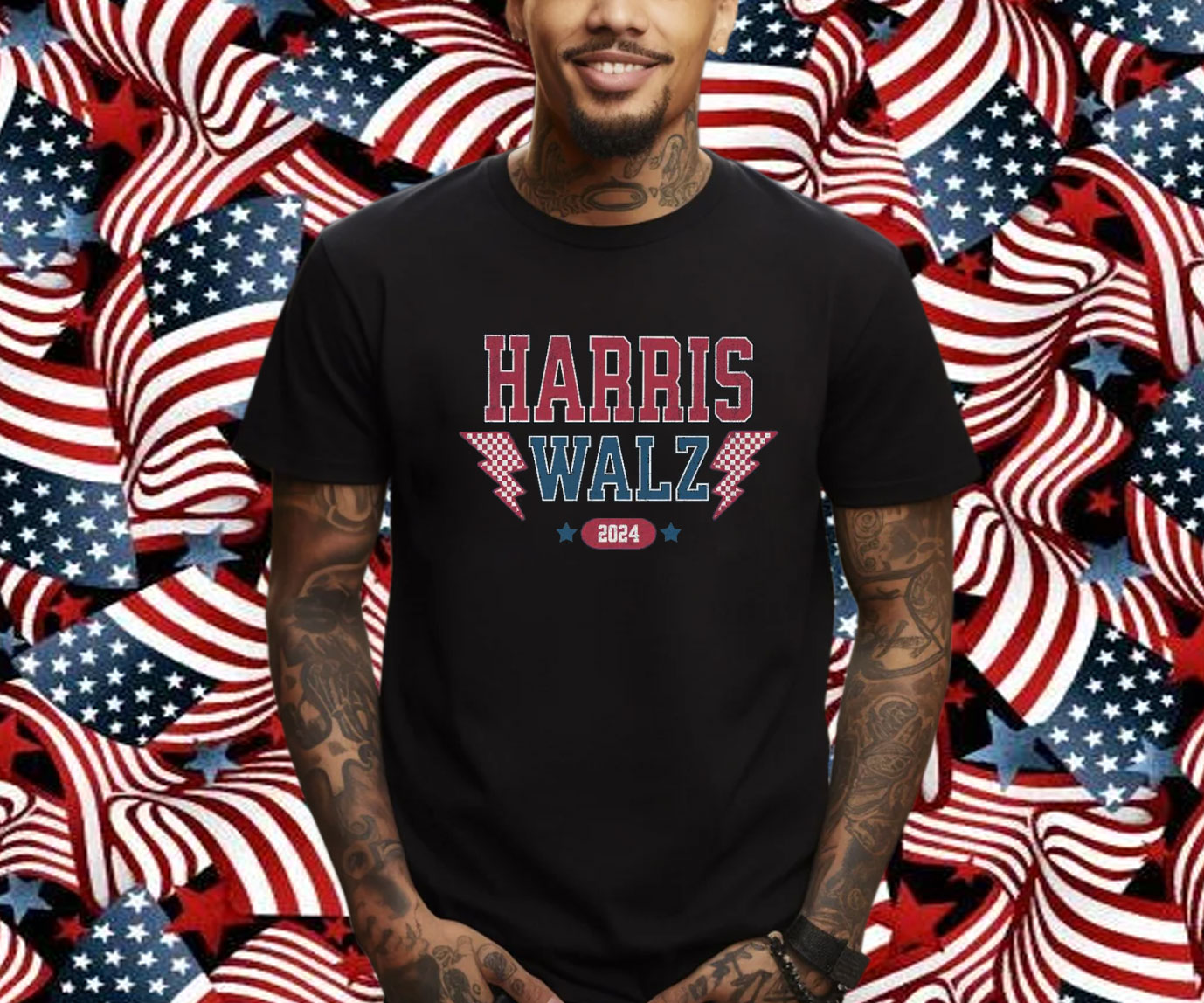 The shirt features a vibrant print of the Harris Walz 2024 logo, prominently displayed on the front. The bold colors and crisp lines command attention, making you an instant advocate for the campaign.