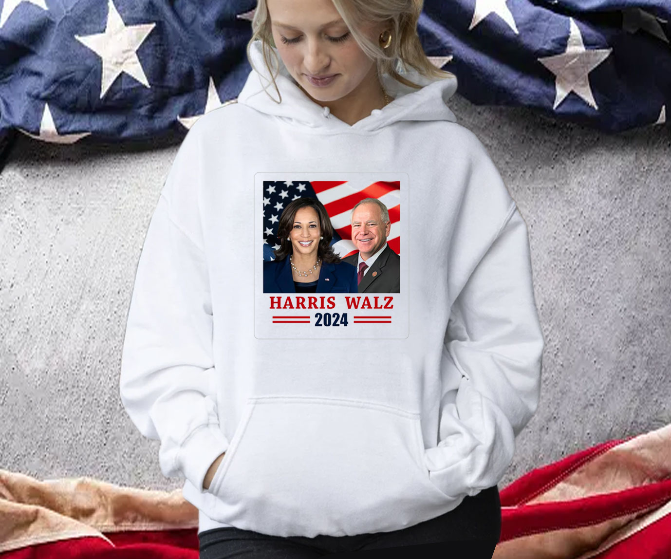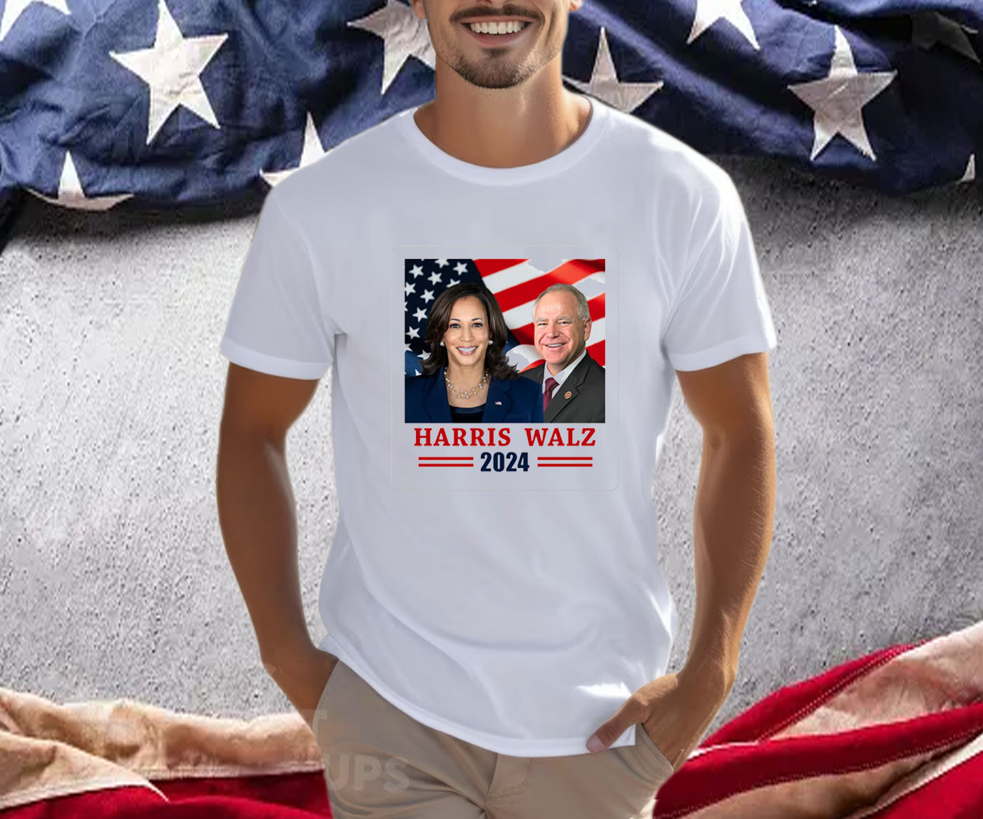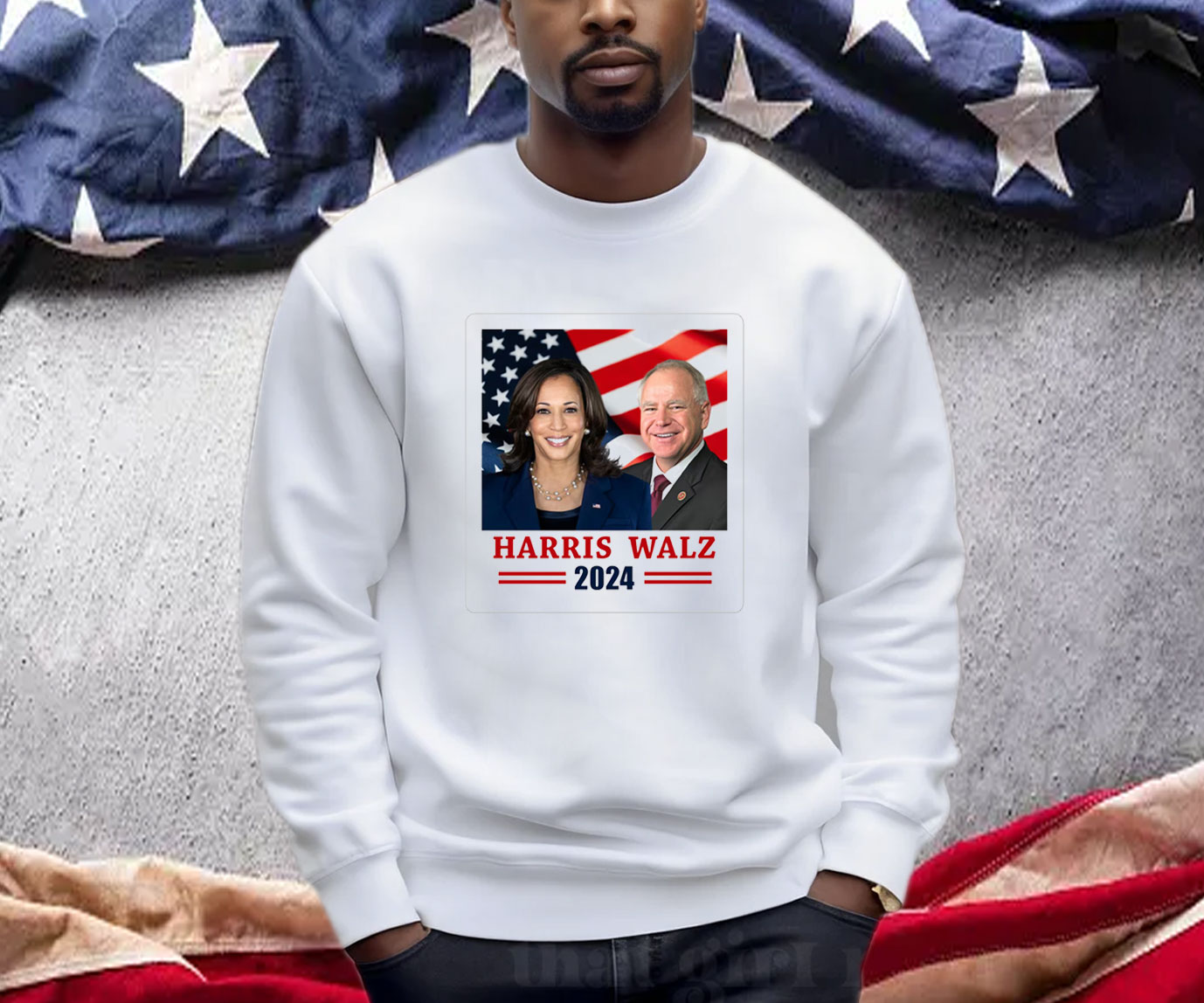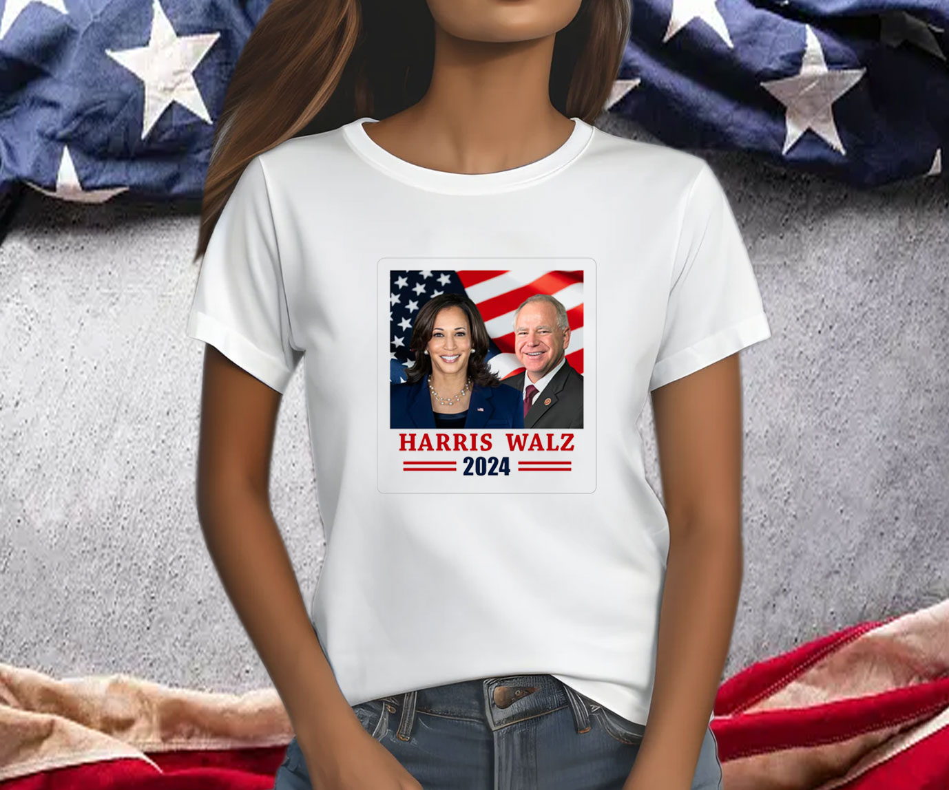 Vibrant USA flag design with “Harris Walz 2024” emblazoned across the chest