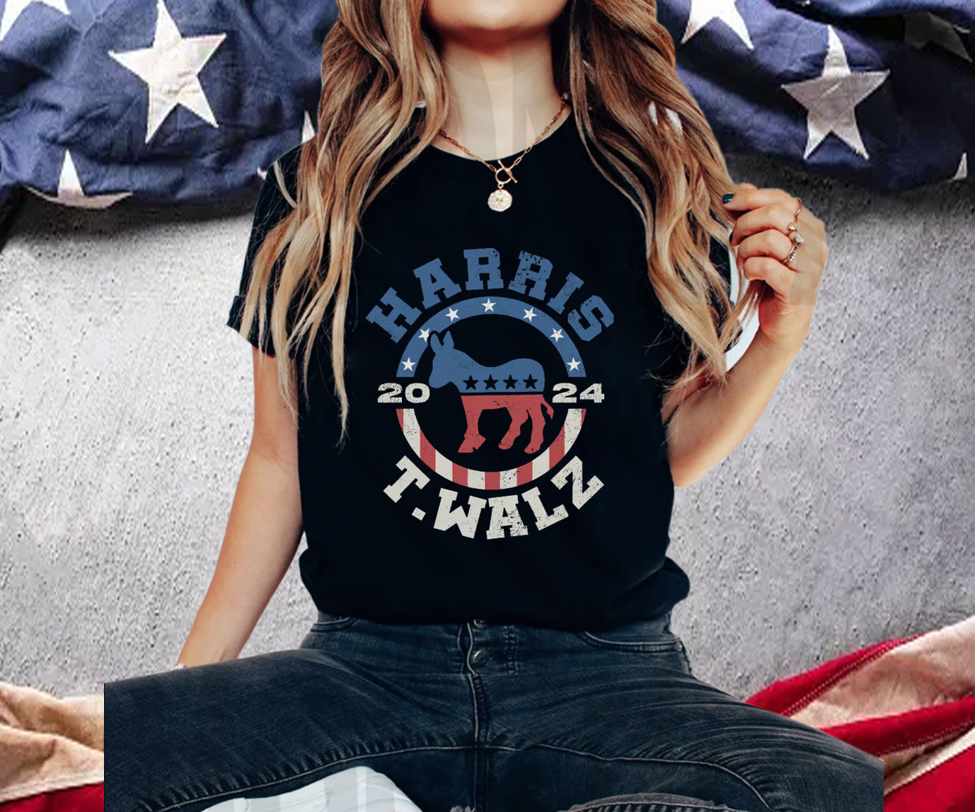 Featuring a bold and eye-catching design, this T-shirt proudly displays the slogan “VOTE FOR HARRIS WALZ 24” in vibrant colors. The high-quality print ensures that the message remains crisp and clear, making a powerful statement wherever you go.
