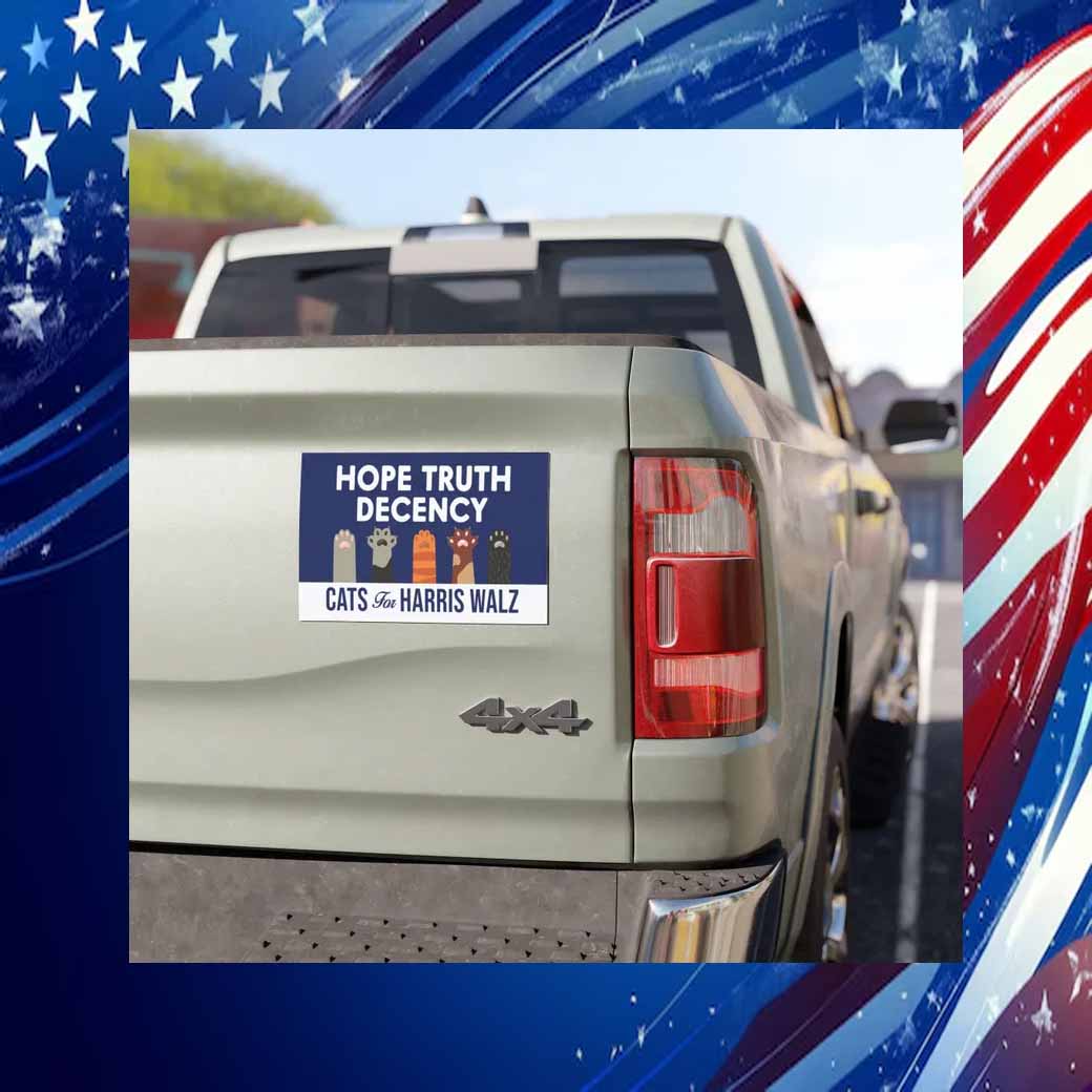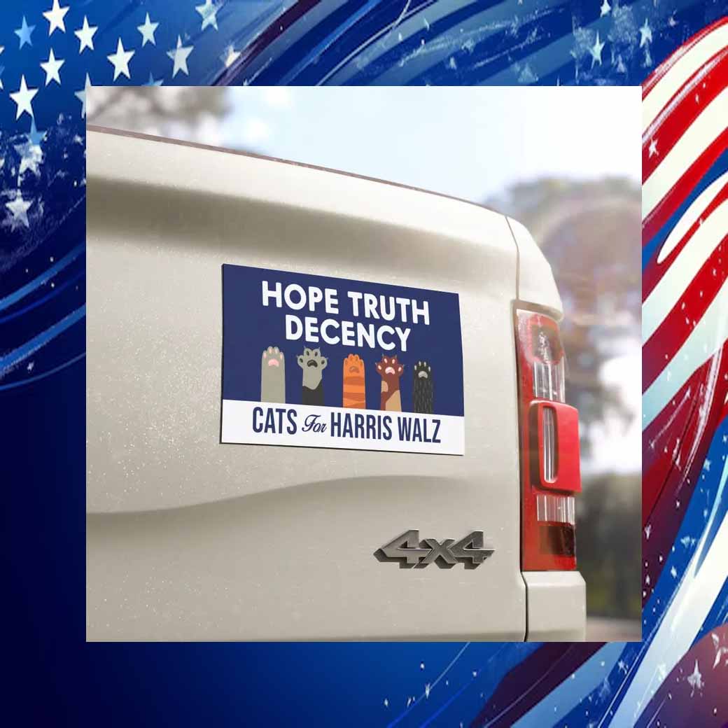 Show your support for Harris Walz in the 2024 election with this eye-catching car magnet! Featuring a vibrant design with the words “Hope, Truth, Decency” and adorable cat graphics, this magnet is a fun and effective way to spread the word about your candidate.