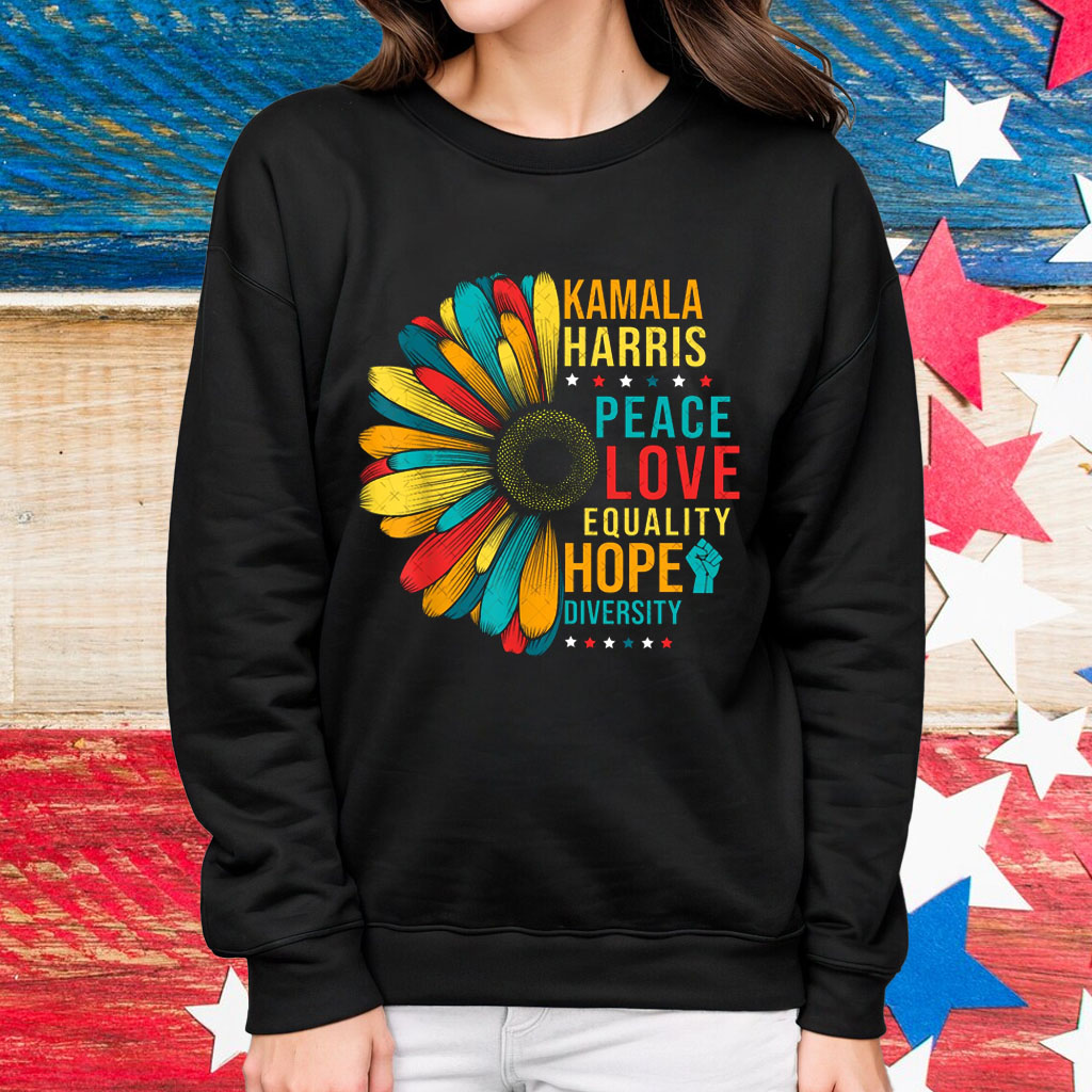 Embrace the spirit of unity and progress with our exclusive Kamala Harris Peace Love Equality Hope Diversity Peace Love Equality Shirt. This powerful statement piece embodies the values that define our nation: