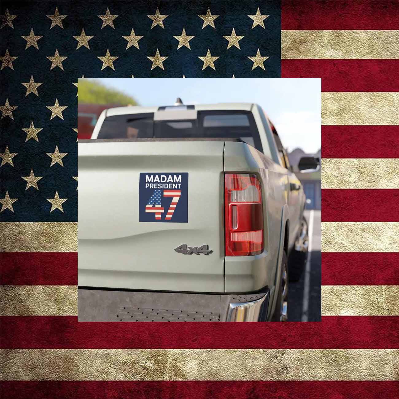 Show your support for the first female, first Black, and first South Asian American Vice President of the United States with our Madam President Harris 47 Car Magnet. This high-quality magnet is made of durable vinyl and features a vibrant, full-color design that will stand out on any vehicle.