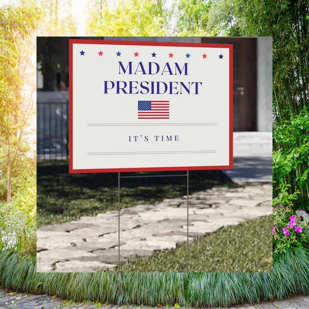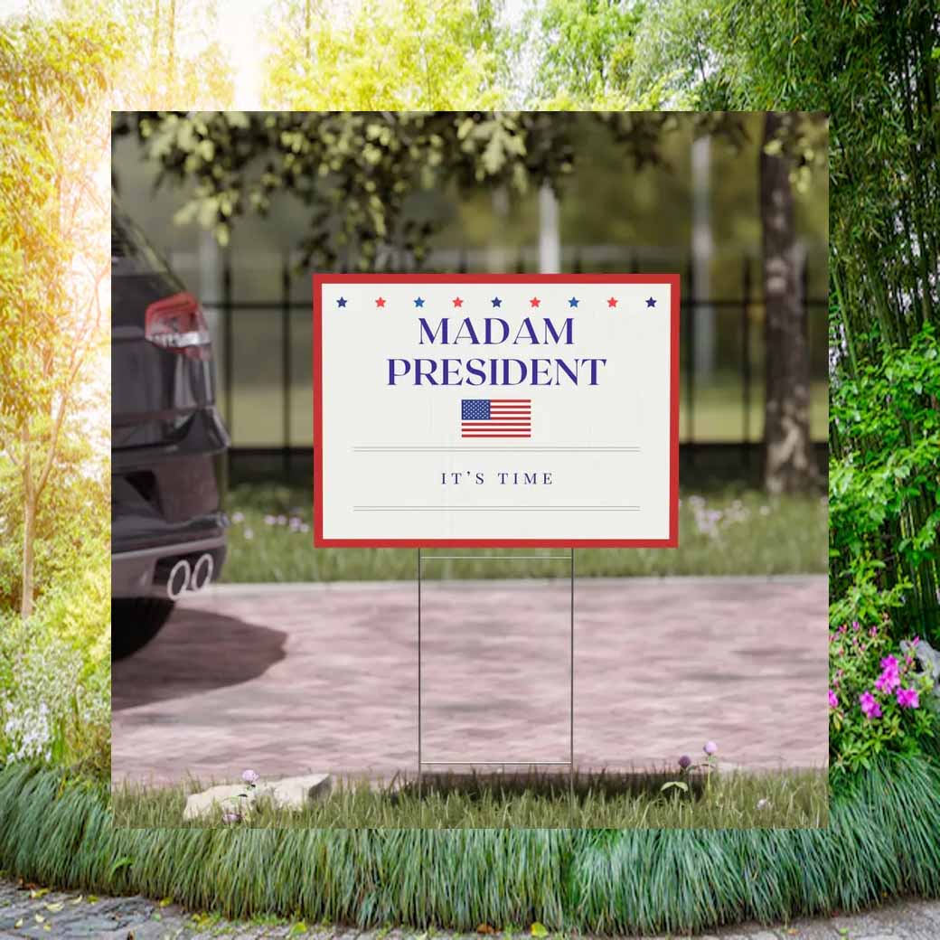 Our “Madam President It’s Time” yard sign is more than just a decoration; it’s a symbol of your commitment to progress and a brighter future for all. By displaying this sign, you are not only making a statement but also contributing to a movement that is changing the face of politics.