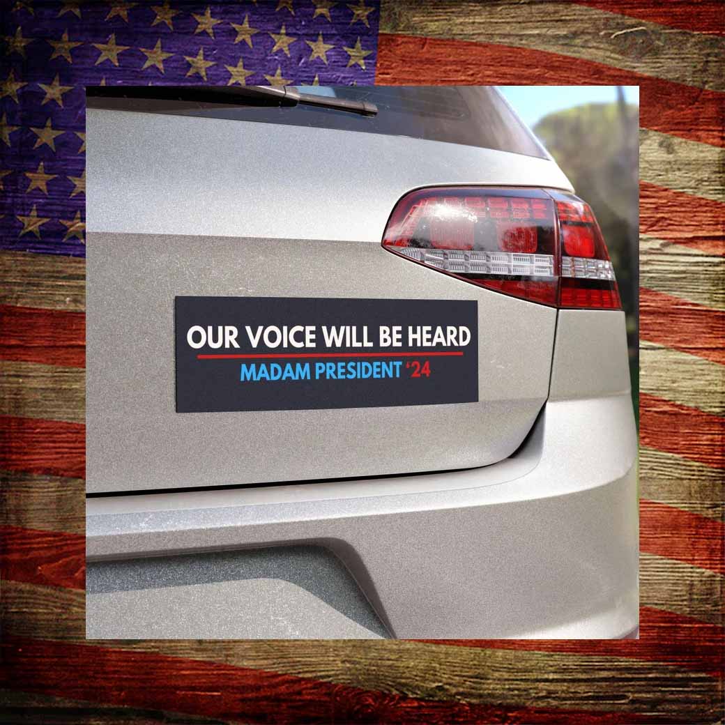 Join the chorus of voices demanding change and show your unwavering support for women’s leadership with our “Madam President Our Voice Will Be Heard” car magnet. Let your vehicle become a beacon of hope and a reminder that our voices will not be silenced.