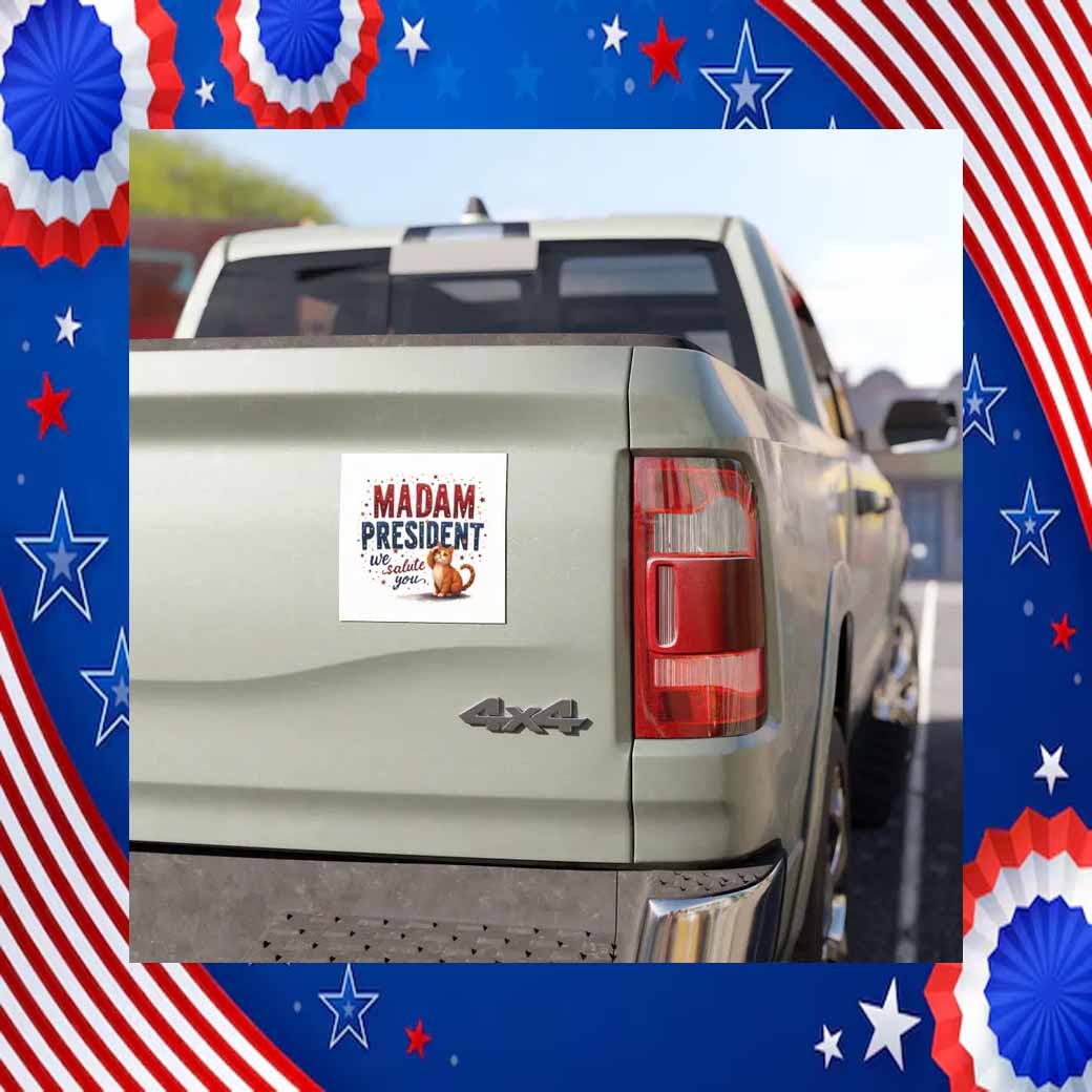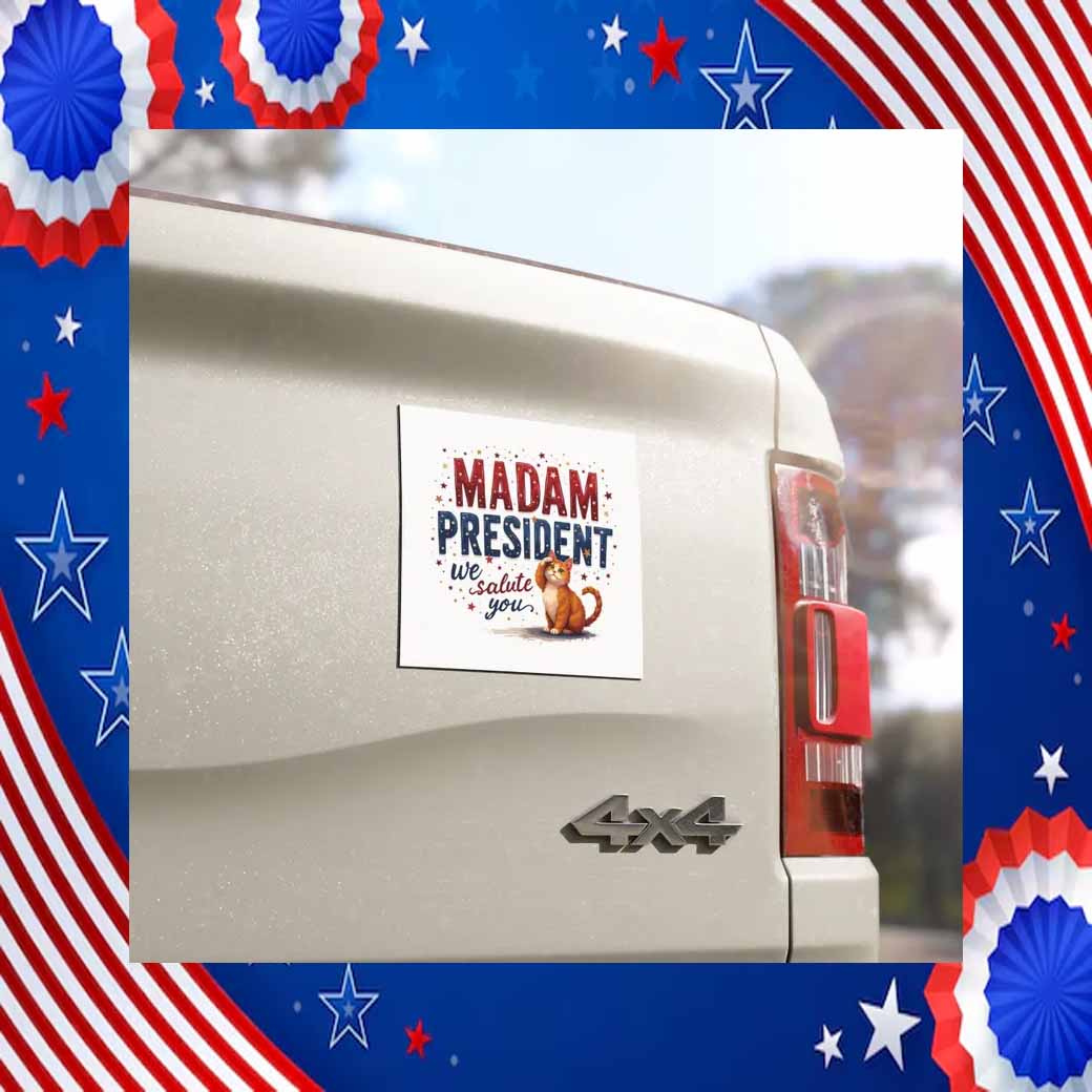 Show your support for the first female president of the United States with this stylish and patriotic cat car magnet. Featuring a bold and eye-catching design, this magnet is sure to turn heads and spark conversations.