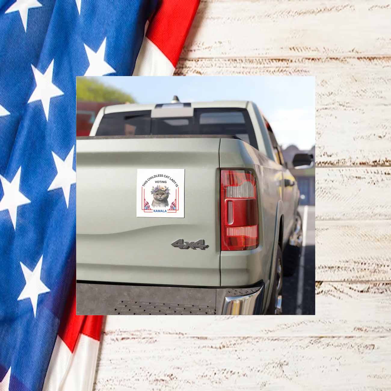 Show your support for Kamala Harris and your feline-loving, child-free lifestyle with this eye-catching car magnet!