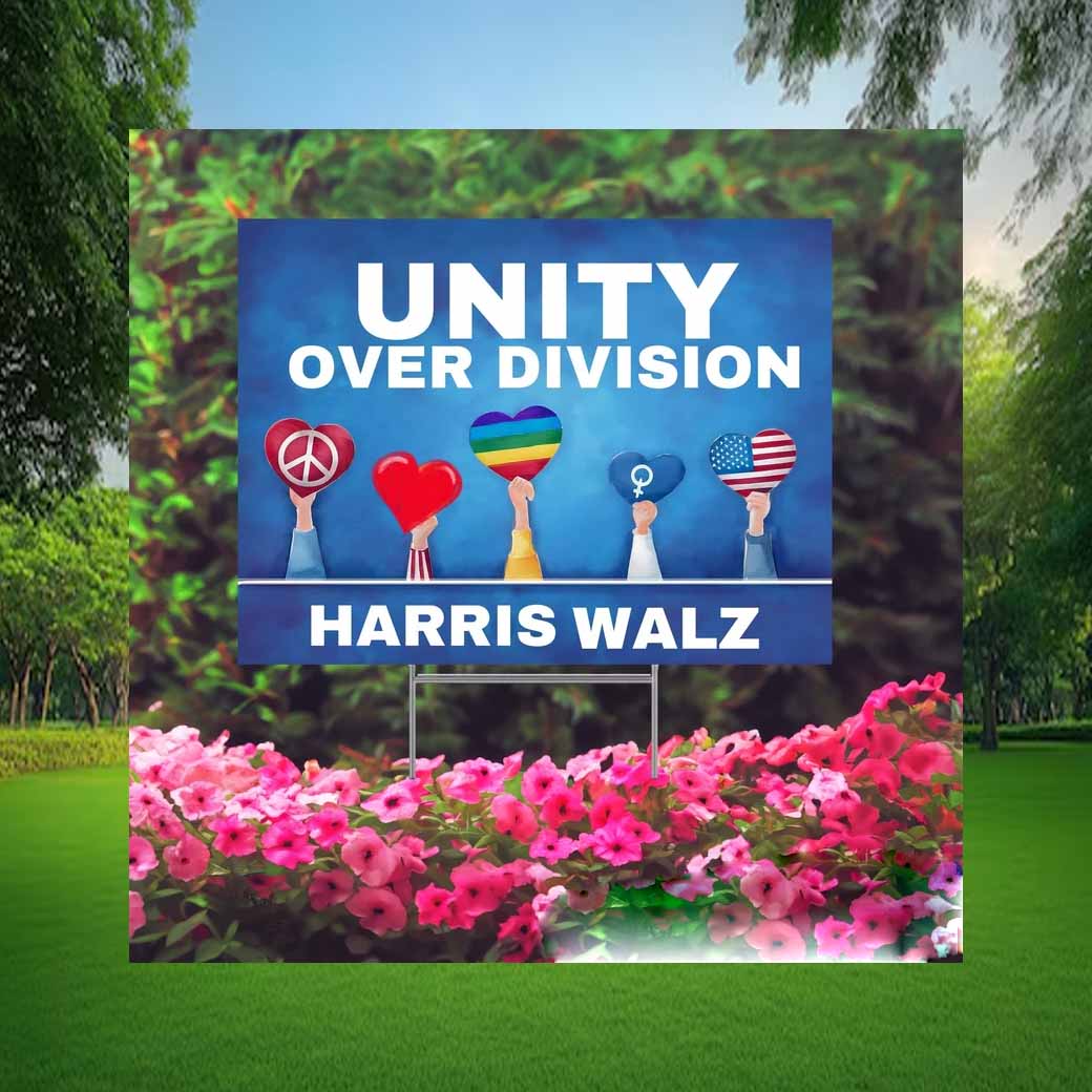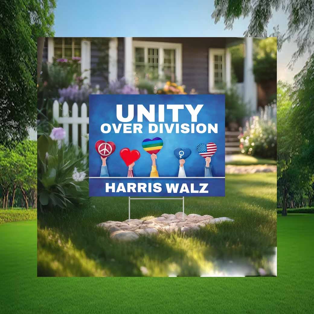 Stand tall for unity and reject division with our vibrant Harris Walz yard sign. Crafted from durable, weather-resistant material, this sign proudly displays the message “Unity Over Division” in bold, eye-catching letters.