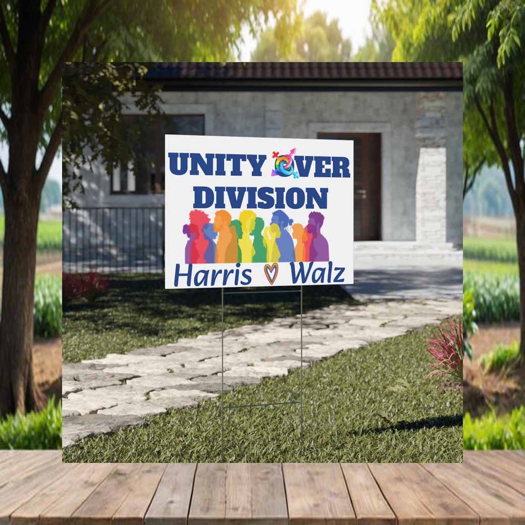 Show your support for unity and progress with our vibrant Unity Over Division yard sign, featuring Kamala Harris and Tim Walz.