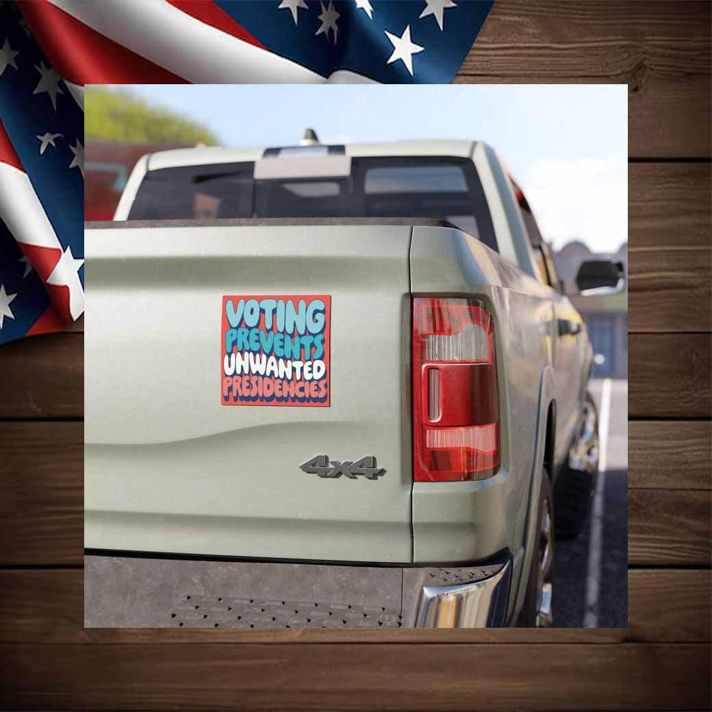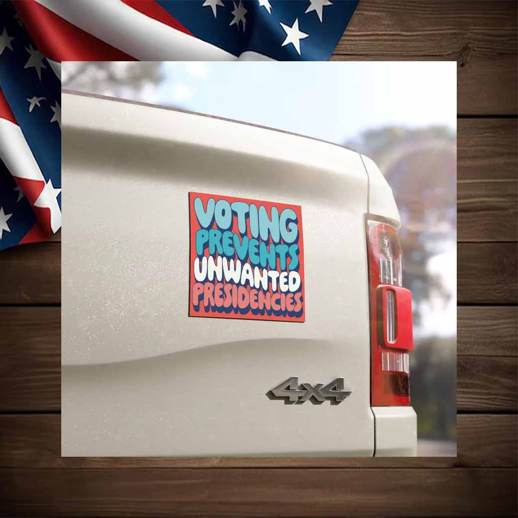 Join the movement to prevent unwanted presidencies. Order your “Voting Prevents Unwanted Presidencies” bumper car magnet today and show the world that your voice matters.