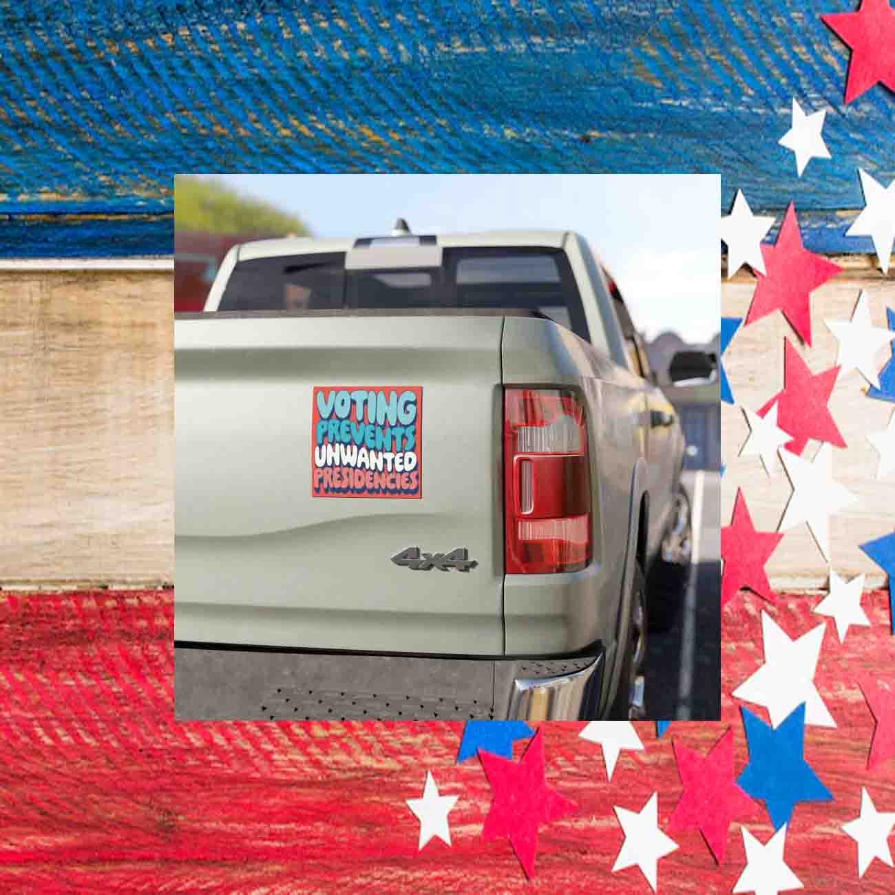 Join the movement to prevent unwanted presidencies. Order your “Voting Prevents Unwanted Presidencies” car magnet today and become an advocate for democracy. Every vote counts, and your voice matters.