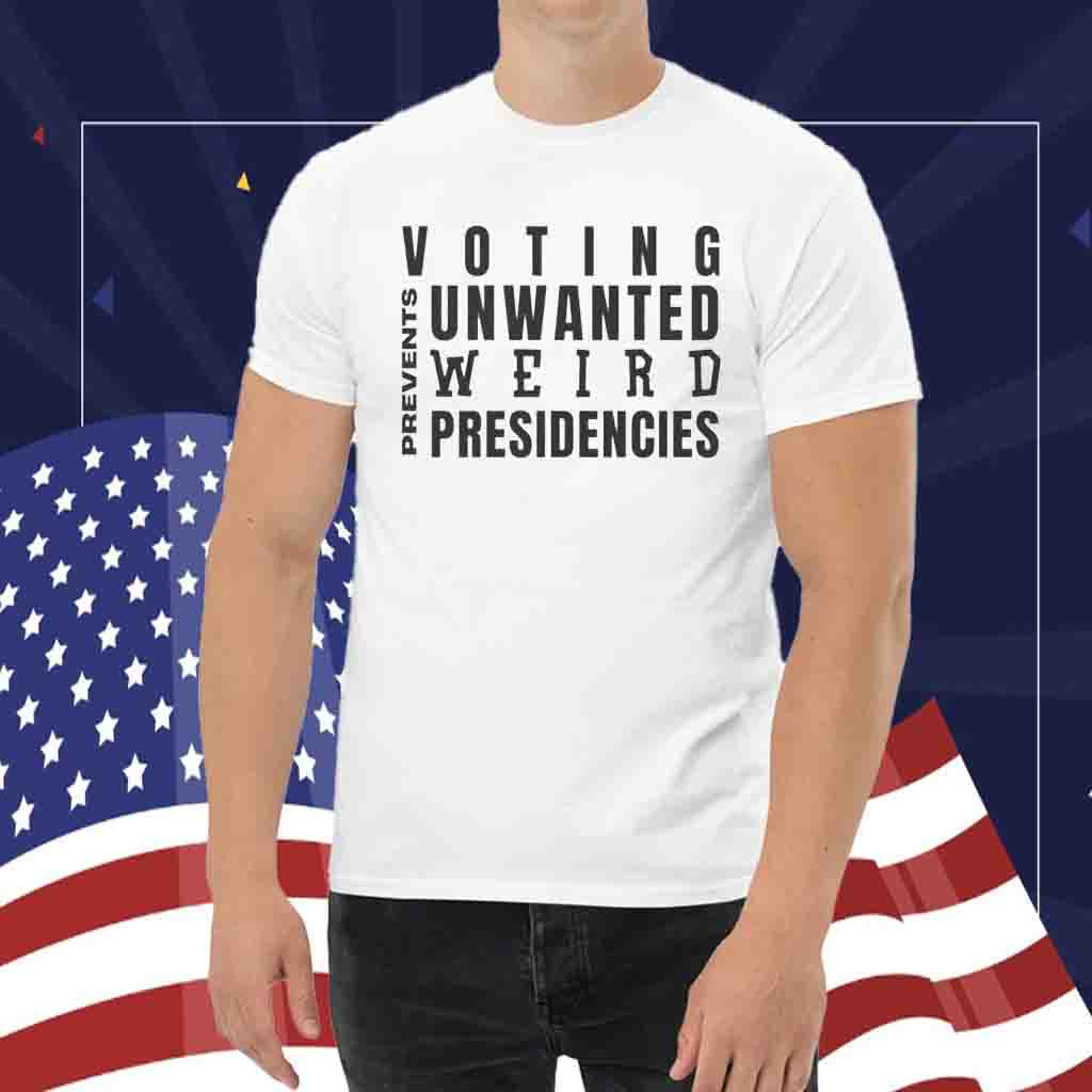 Join the movement to prevent unwanted presidencies. Order your “Voting Prevents Unwanted Weird Presidencies” shirt today and show the world that you’re committed to a better future for our country.