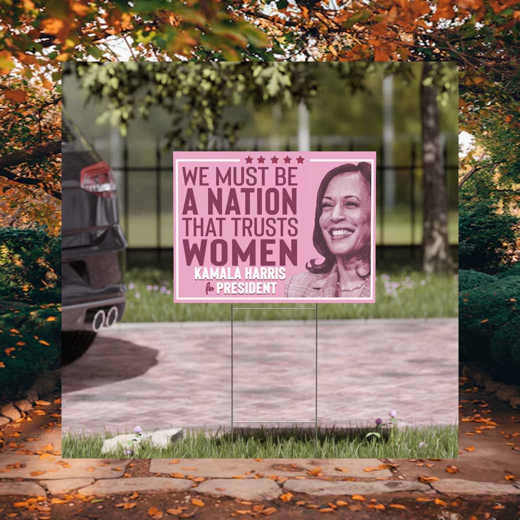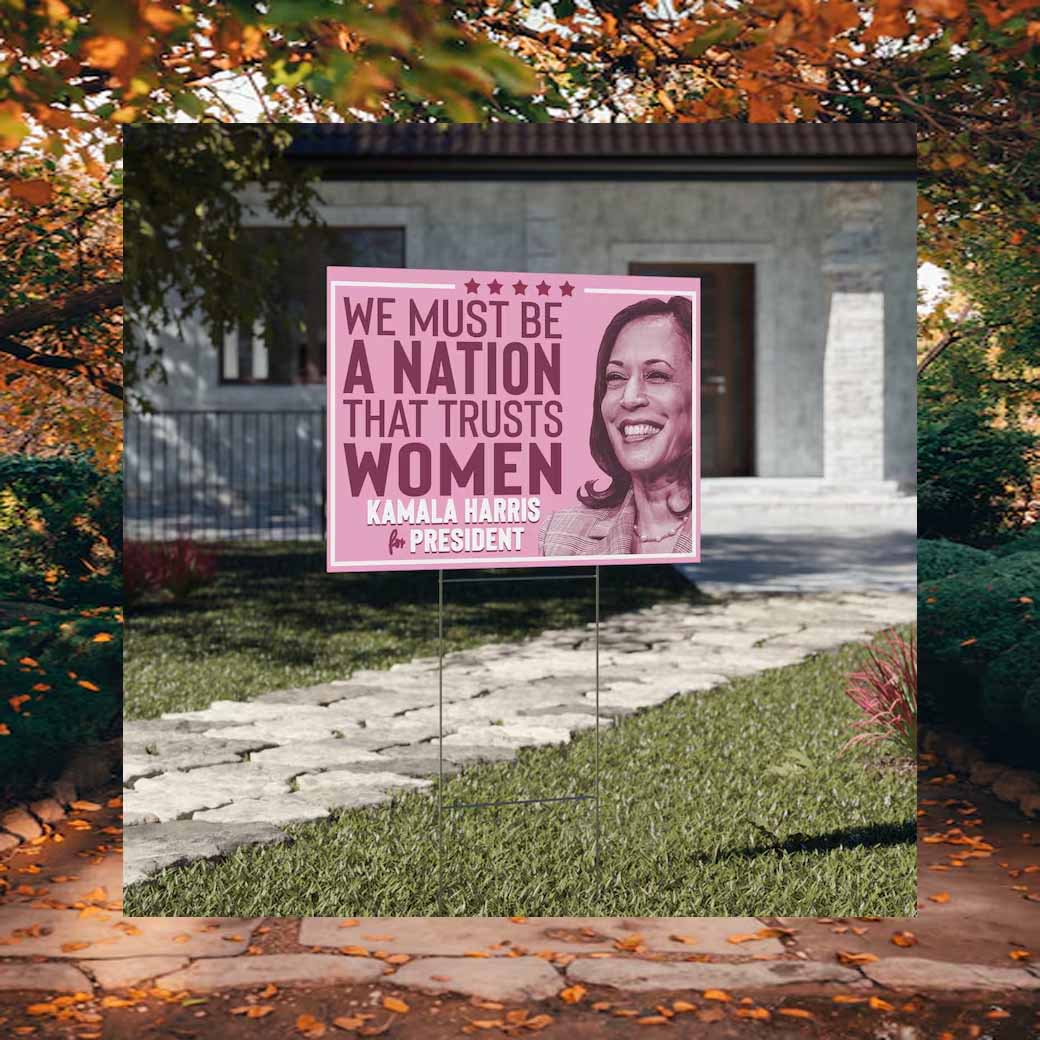 Stand up for women’s rights and empower your community with our bold and impactful “We Must Be a Nation That Trusts Women” yard sign.