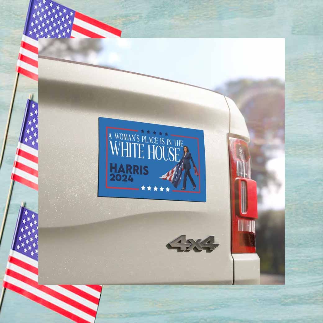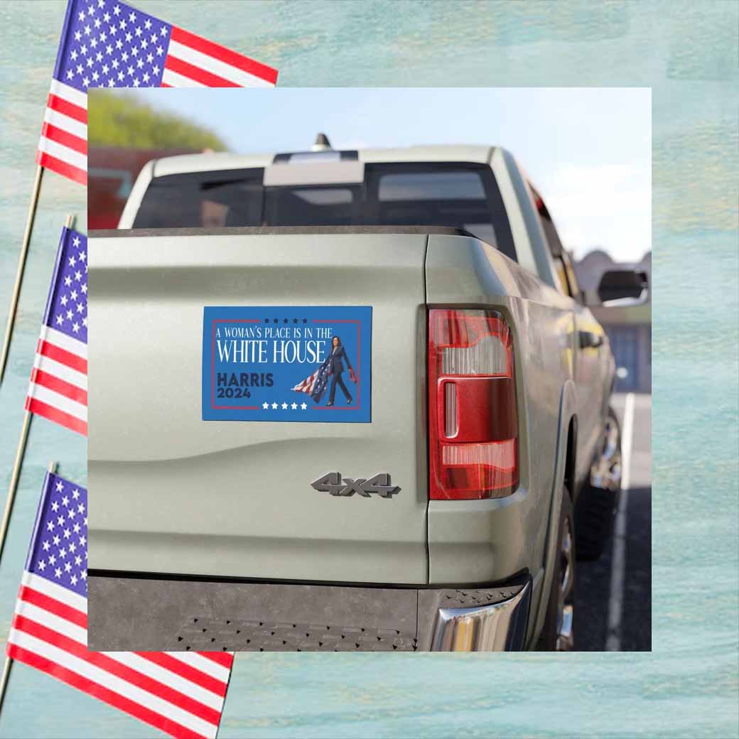 Declare your unwavering support for women’s empowerment and political representation with our bold and impactful “Woman’s Place is in the White House” car magnet.